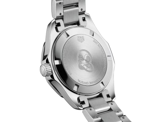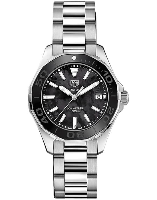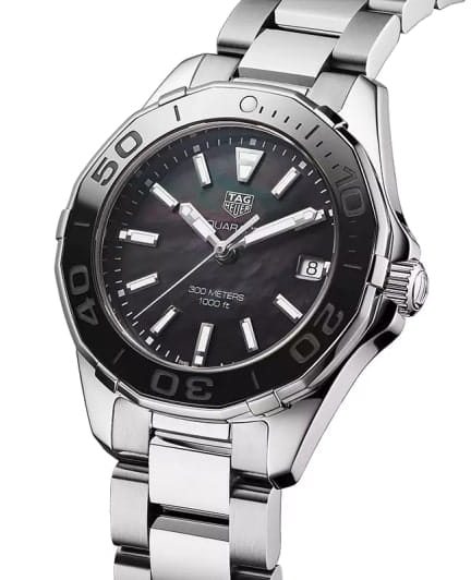 TAG Heuer Aquaracer WAY131K.BA0748 — элегантные женские часы, сочетающие стиль и функциональность. Корпус диаметром 35 мм и толщиной 10,75 мм выполнен из полированной нержавеющей стали, обеспечивая долговечность и устойчивость к коррозии. Лакированный циферблат оснащён накладными часовыми метками и стрелками с люминесцентным покрытиемЛюминесцентное покрытиеПозволяет считывать показания времени в темноте. Производители наносят на стрелки, часовые индексы, безель или поверхность циферблата светонакопительный состав, дающий холодное свечение., обеспечивающим отличную читаемость в любых условиях освещения. Его поверхность защищена сапфировым стекломСапфировое стеклоПрочный и надёжный материал из кристалла сапфира синтетического происхождения, характеризующийся особой твёрдостью и устойчивостью к царапинам и повреждениям., устойчивым к царапинам. Часы оснащены точным кварцевым механизмом, обеспечивающим стабильное отображение времени. Функциональность включает индикацию часов, минут, секунд и даты, расположенной на отметке «3 часа». БезельБезельВнешний ободок, закрепляющий стекло. В спортивных часах так называется поворотное кольцо с делениями на циферблате, выполняет роль таймера – замеряет отрезки времени на шкале. Неподвижный безель – элемент декора. Однонаправленно вращающийся безель на дайверских часах позволяет фиксировать моменты погружения и выныривания на поверхность. однонаправленный вращающийся, выполнен из стали, устойчивой к царапинам. Водозащита до 300 метров (30 бар) делает модель подходящей для дайвинга и активного образа жизни. Стальной браслет на раскладной застёжкеРаскладная застёжкаТакой тип застёжки используется только на браслетах из металла. Она никогда не раскрывается полностью, происходит разделение на 2 и более частей. Раскладывающая застёжка снизит вероятность потери часов к минимуму..