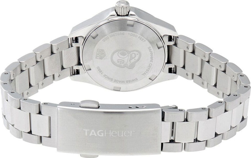 Изысканные кварцевые женские часы TAG Heuer Aquaracer WBD1410.BA0741 с большим, выразительным корпусом диаметром 27 мм из нержавеющей стали. Кварцевый механизм с высокой точностью. Сапфировое стеклоСапфировое стеклоПрочный и надёжный материал из кристалла сапфира синтетического происхождения, характеризующийся особой твёрдостью и устойчивостью к царапинам и повреждениям. устойчивое к появлению царапин, обладающее высокой прозрачностью. Класс водозащиты: 300 метров, позволит плавать, нырять и заниматься другими водными видами спорта. Корпус часов изготовлен из стали, серебристого цвета. Стрелки с люминесцентным покрытиемЛюминесцентное покрытиеПозволяет считывать показания времени в темноте. Производители наносят на стрелки, часовые индексы, безель или поверхность циферблата светонакопительный состав, дающий холодное свечение.. Стальной браслет на раскладной застёжкеРаскладная застёжкаТакой тип застёжки используется только на браслетах из металла. Она никогда не раскрывается полностью, происходит разделение на 2 и более частей. Раскладывающая застёжка снизит вероятность потери часов к минимуму..