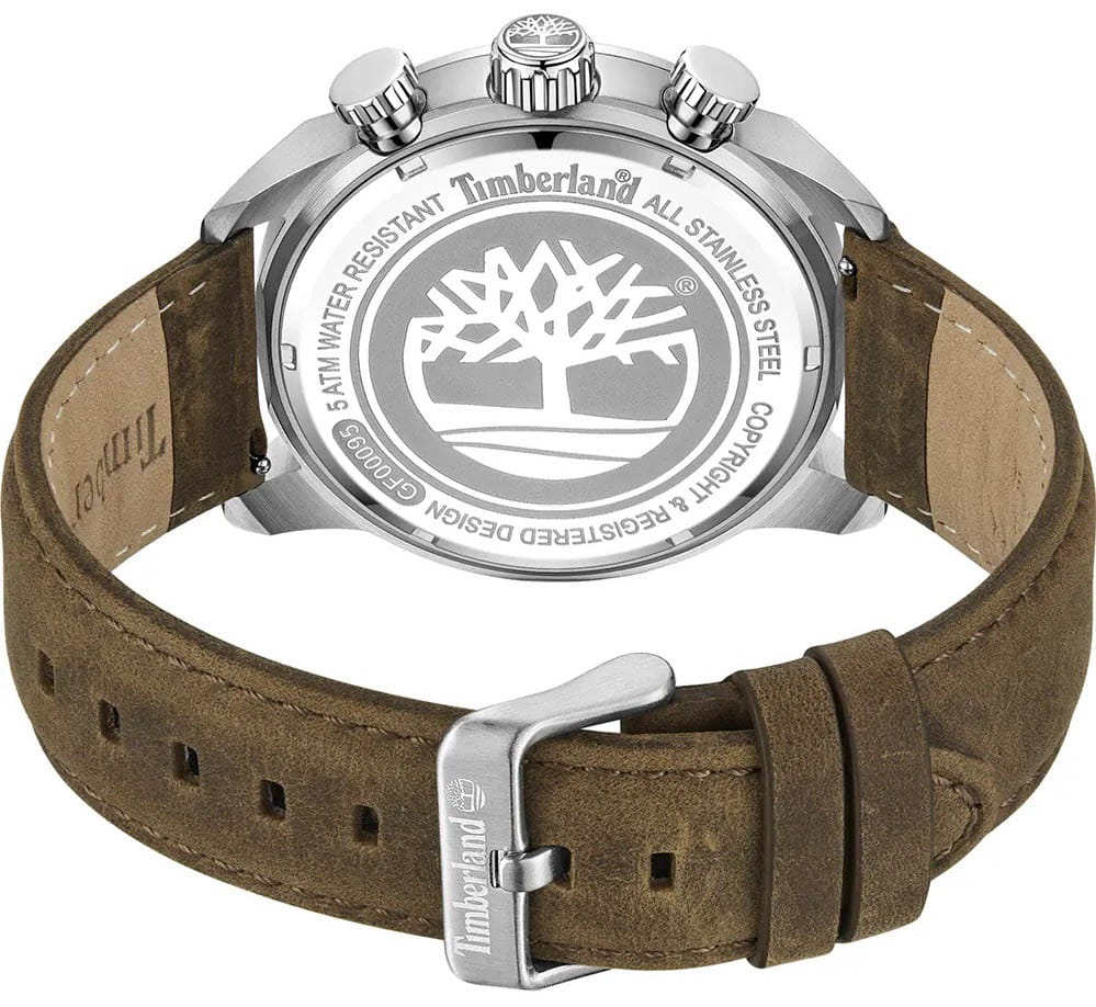 Американские мужские часы-хронографХронографФункция позволяет измерять отрезки времени с особой точностью: часы, минуты, секунды. Верным признаком хронографа является наличие на циферблате 3 дополнительных окошек-счётчиков. Timberland Henniker II TDWGF0009501 имеют кварцевый механизм с высокой точностью. Класс водозащиты: 50 метров, позволит защитить корпус от случайных брызг или капель дождя. Корпус часов изготовлен из стали. Циферблат украшен объемным логотипом бренда. Прочное минеральное стеклоМинеральное стеклоМинеральное стекло представляет собой искусственно выращенный минерал кварца. Такое стекло отличается особой устойчивостью к повреждениям и царапинам. Уступает по некоторым качествам сапфировому стеклу.. Стрелки c люминесцентным покрытиемЛюминесцентное покрытиеПозволяет считывать показания времени в темноте. Производители наносят на стрелки, часовые индексы, безель или поверхность циферблата светонакопительный состав, дающий холодное свечение.. Кожаный ремешок с классической застежкой и системой быстрой замены.