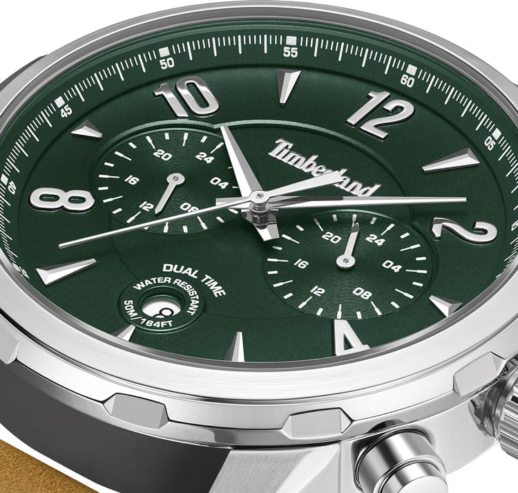Мужские кварцевые часы Timberland — это стильный и надежный аксессуар. Корпус диаметром 46 мм выполнен из стали. Циферблат зелёного цвета оформлен арабскими цифрами, штрихами и стрелками. Присутствует индикация второго часового пояса в 24-часовом формате. Окошко даты расположено в положении 6 часов. Циферблат защищён минеральным стекломМинеральное стеклоМинеральное стекло представляет собой искусственно выращенный минерал кварца. Такое стекло отличается особой устойчивостью к повреждениям и царапинам. Уступает по некоторым качествам сапфировому стеклу.. Часы оснащены пшеничным кожаным ремешком из премиальной натуральной кожи на классической пряжке с системой быстрой замены. Водонепроницаемость 50 м позволяет использовать часы в повседневных условиях. Идеальный выбор для тех, кто ценит американское качество и устойчивый стиль.