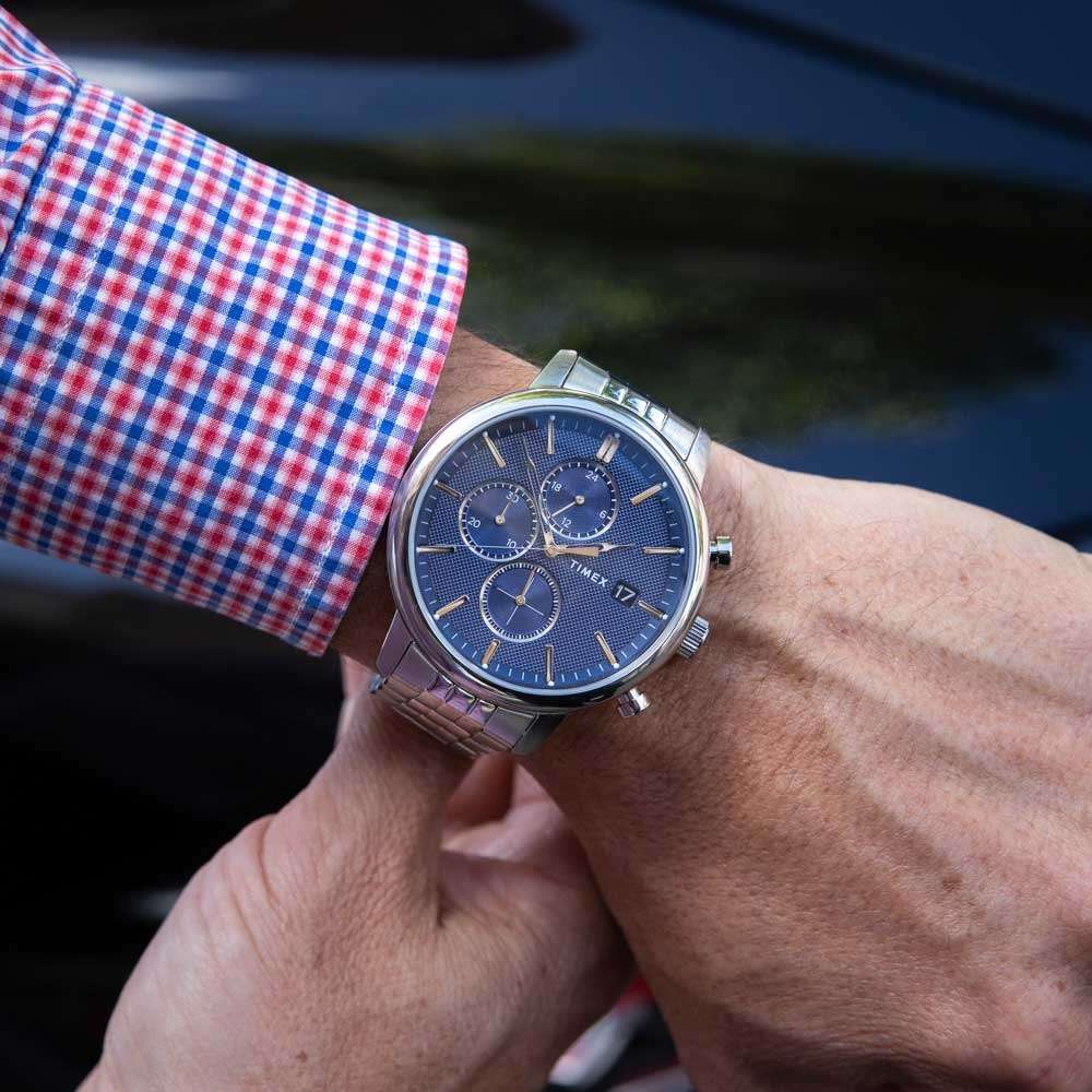 Наручные часы Timex TW2V01700 — это стильный и функциональный аксессуар, который идеально подойдет для повседневного использования. Изготовленные в США, они оснащены надежным кварцевым механизмом, обеспечивающим точность хода. Корпус часов выполнен из металла с латунью и покрыт PVDPVDУльтратонкое покрытие наносится в технике вакуумного напыления, сочетает в себе нитрид титана особой прочности со слоем золота или оксида хрома. Несёт в себе декоративную или защитную функцию., что придает изделию современный и элегантный вид. Глубокий синий циферблат украшен метками в виде штрихов и имеет окошко календаря для удобного отображения даты. Рифленая заводная головка и стальная задняя крышка добавляют часам изысканности и надежности. Стальной браслет с раскладной застёжкойРаскладная застёжкаТакой тип застёжки используется только на браслетах из металла. Она никогда не раскрывается полностью, происходит разделение на 2 и более частей. Раскладывающая застёжка снизит вероятность потери часов к минимуму. обеспечивает комфортную посадку и надежную фиксацию на запястье. Водозащита 50WR позволяет использовать часы в различных условиях, защищая их от влаги. Минеральное стеклоМинеральное стеклоМинеральное стекло представляет собой искусственно выращенный минерал кварца. Такое стекло отличается особой устойчивостью к повреждениям и царапинам. Уступает по некоторым качествам сапфировому стеклу. защищает циферблат от царапин и повреждений, сохраняя его первозданный вид. Размеры корпуса составляют 43 мм в диаметре, а ширина ремешка — 20 мм, что делает часы выразительными и удобными в носке. Эти часы-хронографХронографФункция позволяет измерять отрезки времени с особой точностью: часы, минуты, секунды. Верным признаком хронографа является наличие на циферблате 3 дополнительных окошек-счётчиков. с секундомеромСекундомерСекундоме́р — прибор, способный измерять интервалы времени с точностью до долей секунды. станут отличным дополнением к вашему стилю.