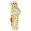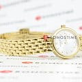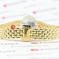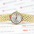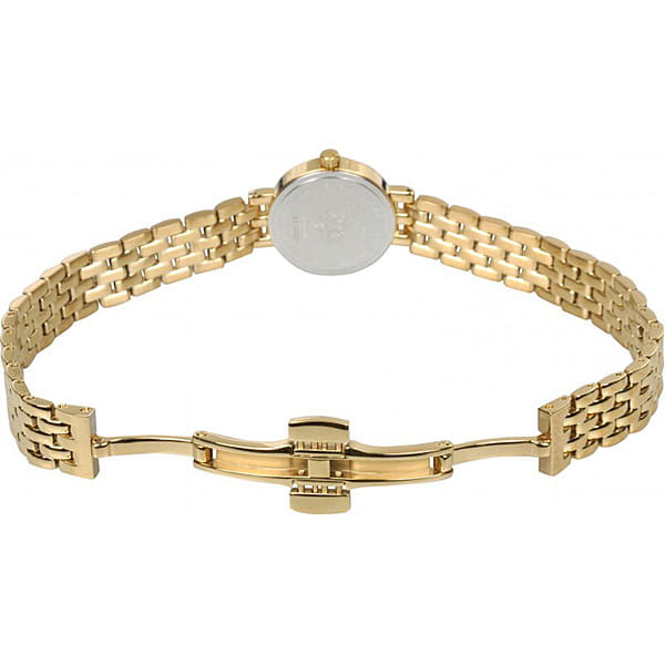 Утончённая модель швейцарского производства выполнена в золотистом цвете, исключение составляет белый циферблат. Такой оттенок был получен благодаря плотному слою PVD-покрытияPVDУльтратонкое покрытие наносится в технике вакуумного напыления, сочетает в себе нитрид титана особой прочности со слоем золота или оксида хрома. Несёт в себе декоративную или защитную функцию., устойчивому к износу. Классический аксессуар дополнен изящным браслетом необычного плетения, часы выглядят, как ювелирное изделие. Кварцевый механизм ETA 901.001 с высокой точностью хода. Сапфировое стекло. Гравировка на задней крышке. Водонепроницаемость 3 бар. Габариты: 19,5 x 19,5 x 5 мм.