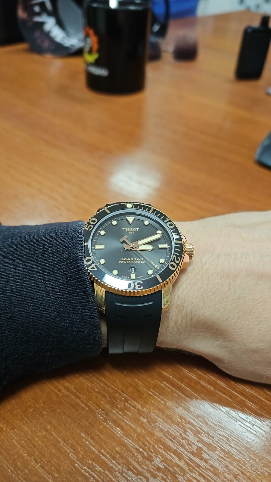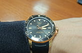 Аксессуар характеризуется как дайверские часы, водонепроницаемость сохраняется при давлении до 30 бар на глубине 300 метров. Модель имеет чёрно-золотистое исполнение, последний оттенок был реализован благодаря PVD-покрытиюPVDУльтратонкое покрытие наносится в технике вакуумного напыления, сочетает в себе нитрид титана особой прочности со слоем золота или оксида хрома. Несёт в себе декоративную или защитную функцию.. Внутри герметичного корпуса с завинчивающейся заводной головкой находится популярный швейцарский калибр Powermatic 80Powermatic 80Эксклюзивный калибр от швейцарской компании ETA с увеличенным запасом хода до 80 часов за счёт удлинённой заводной пружины. Характеризуется улучшенной системой спуска со сниженным трением. с запасом хода до 80 часов. Прозрачная задняя крышка. Керамический безельБезельВнешний ободок, закрепляющий стекло. В спортивных часах так называется поворотное кольцо с делениями на циферблате, выполняет роль таймера – замеряет отрезки времени на шкале. Неподвижный безель – элемент декора. Однонаправленно вращающийся безель на дайверских часах позволяет фиксировать моменты погружения и выныривания на поверхность.. Гибкий каучуковый ремешок. Люминесцентная подсветкаЛюминесцентное покрытиеПозволяет считывать показания времени в темноте. Производители наносят на стрелки, часовые индексы, безель или поверхность циферблата светонакопительный состав, дающий холодное свечение.. Окошко даты. Габариты: 43 x 43 x 12,7 мм.