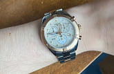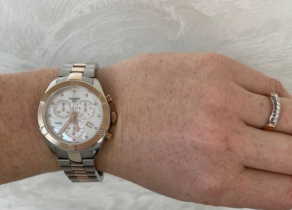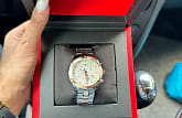 Корпус выполнен из нержавеющей стали, а перламутровый циферблат защищён сапфировым стеклом, устойчивым к царапинам.