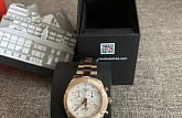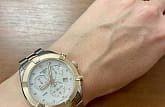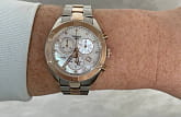 Швейцарские наручные часы имеют перламутровый циферблат, инкрустированный бриллиантами, драгоценные камни используются вместо меток часов. Корпус и центральные звенья браслета имеют PVD-покрытие цвета розового золота, оно характеризуется долговечностью и устойчивостью к царапинам. Кварцевый механизм ETA G15.212. Водонепроницаемость 100 метров. Хронограф, секундомер, апертура даты. Габариты: 38 x 38 x 10,5 мм.