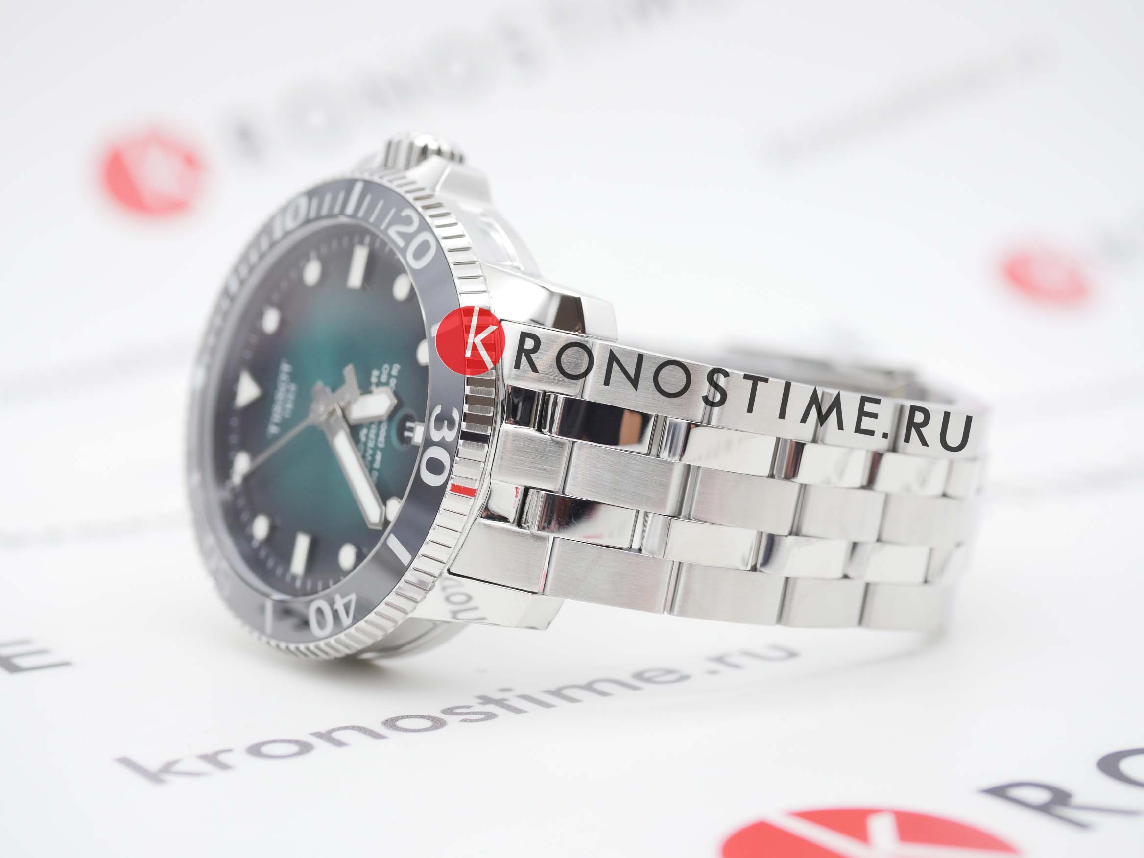 На фоне серебристого браслета и темного безеляБезельВнешний ободок, закрепляющий стекло. В спортивных часах так называется поворотное кольцо с делениями на циферблате, выполняет роль таймера – замеряет отрезки времени на шкале. Неподвижный безель – элемент декора. Однонаправленно вращающийся безель на дайверских часах позволяет фиксировать моменты погружения и выныривания на поверхность. ярко выделяется зеленый циферблат, отлично видны серебристые стрелки и часовые метки с люминесцентным покрытиемЛюминесцентное покрытиеПозволяет считывать показания времени в темноте. Производители наносят на стрелки, часовые индексы, безель или поверхность циферблата светонакопительный состав, дающий холодное свечение.. Механические часы с автоподзаводом оснащены швейцарским механизмом Powermatic 80Powermatic 80Эксклюзивный калибр от швейцарской компании ETA с увеличенным запасом хода до 80 часов за счёт удлинённой заводной пружины. Характеризуется улучшенной системой спуска со сниженным трением. с запасом хода 80 часов. Завинчивающиеся кнопки, головка, прозрачная задняя крышка. Сапфировое стекло. Апертура даты. Габариты: 43 x 43 x 12,7 мм.