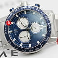 Современный хронографХронографФункция позволяет измерять отрезки времени с особой точностью: часы, минуты, секунды. Верным признаком хронографа является наличие на циферблате 3 дополнительных окошек-счётчиков. поможет подчеркнуть продуманный образ делового мужчины. Модель выполнена в спокойной серебристо-синей расцветке. Наручные часы функционируют благодаря швейцарскому кварцевому механизму. Калибр отличается максимальной точностью хода. Водостойкость 100 метров. Надёжный корпус из антикоррозионной стали 316L. Люминесцентная подсветкаЛюминесцентное покрытиеПозволяет считывать показания времени в темноте. Производители наносят на стрелки, часовые индексы, безель или поверхность циферблата светонакопительный состав, дающий холодное свечение. стрелок и индексов. Отображение даты. Диаметр корпуса: 45,5 мм.