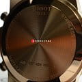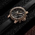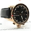 Аксессуар позволит грамотно дополнить образ, гармония чёрно-золотистой палитры никогда не потеряет актуальности. Наручные часы позволят всегда находиться в центре внимания. Массивный циферблат с крупной индикацией времени, симметричным расположением окошек – важная деталь для делового мужчины, привыкшего всё делать вовремя. Ремешок из тисненой натуральной кожи имеет белую прострочку, вдохновение идет от спортивных моделей. Швейцарский кварцевый механизм ETA G10.212. Сапфировое стекло. Корпус из нержавеющей стали 316L с цветным PVD-покрытиемPVDУльтратонкое покрытие наносится в технике вакуумного напыления, сочетает в себе нитрид титана особой прочности со слоем золота или оксида хрома. Несёт в себе декоративную или защитную функцию.. БезельБезельВнешний ободок, закрепляющий стекло. В спортивных часах так называется поворотное кольцо с делениями на циферблате, выполняет роль таймера – замеряет отрезки времени на шкале. Неподвижный безель – элемент декора. Однонаправленно вращающийся безель на дайверских часах позволяет фиксировать моменты погружения и выныривания на поверхность. размечен шкалой тахиметраТахиметрРазмеченная шкала, располагается на ободке или безеле часов. Тахиметр позволяет рассчитать скорость на определённом участке пути, расстояние измеряется в километрах или милях.. Водонепроницаемость до 10 бар. Люминесцентная подсветкаЛюминесцентное покрытиеПозволяет считывать показания времени в темноте. Производители наносят на стрелки, часовые индексы, безель или поверхность циферблата светонакопительный состав, дающий холодное свечение.. Секундомер, хронографХронографФункция позволяет измерять отрезки времени с особой точностью: часы, минуты, секунды. Верным признаком хронографа является наличие на циферблате 3 дополнительных окошек-счётчиков., индикация числа. Диаметр корпуса: 45,5 мм.