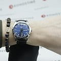 Синий циферблат выполнен в классическом стиле, ему под стать стильный ремешок из натуральной коровьей кожи. Корпус из долговечной хирургической стали 316L надёжно защищает кварцевый калибр ETA F06.115 с высокой точностью хода. Лаконичность и элегантное исполнение. Сапфировое стеклоСапфировое стеклоПрочный и надёжный материал из кристалла сапфира синтетического происхождения, характеризующийся особой твёрдостью и устойчивостью к царапинам и повреждениям.. Водонепроницаемость 100 метров. Отображение числа, функция EOLEOLПредставляет собой систему, уведомляющую владельца часов о необходимости замены элемента питания. За 2 недели до полного разряда батарейки секундная стрелка перестаёт ходить чётко и начинает перепрыгивать на 3-4 деления.. Габариты: 40 x 40 x 8,5 мм.