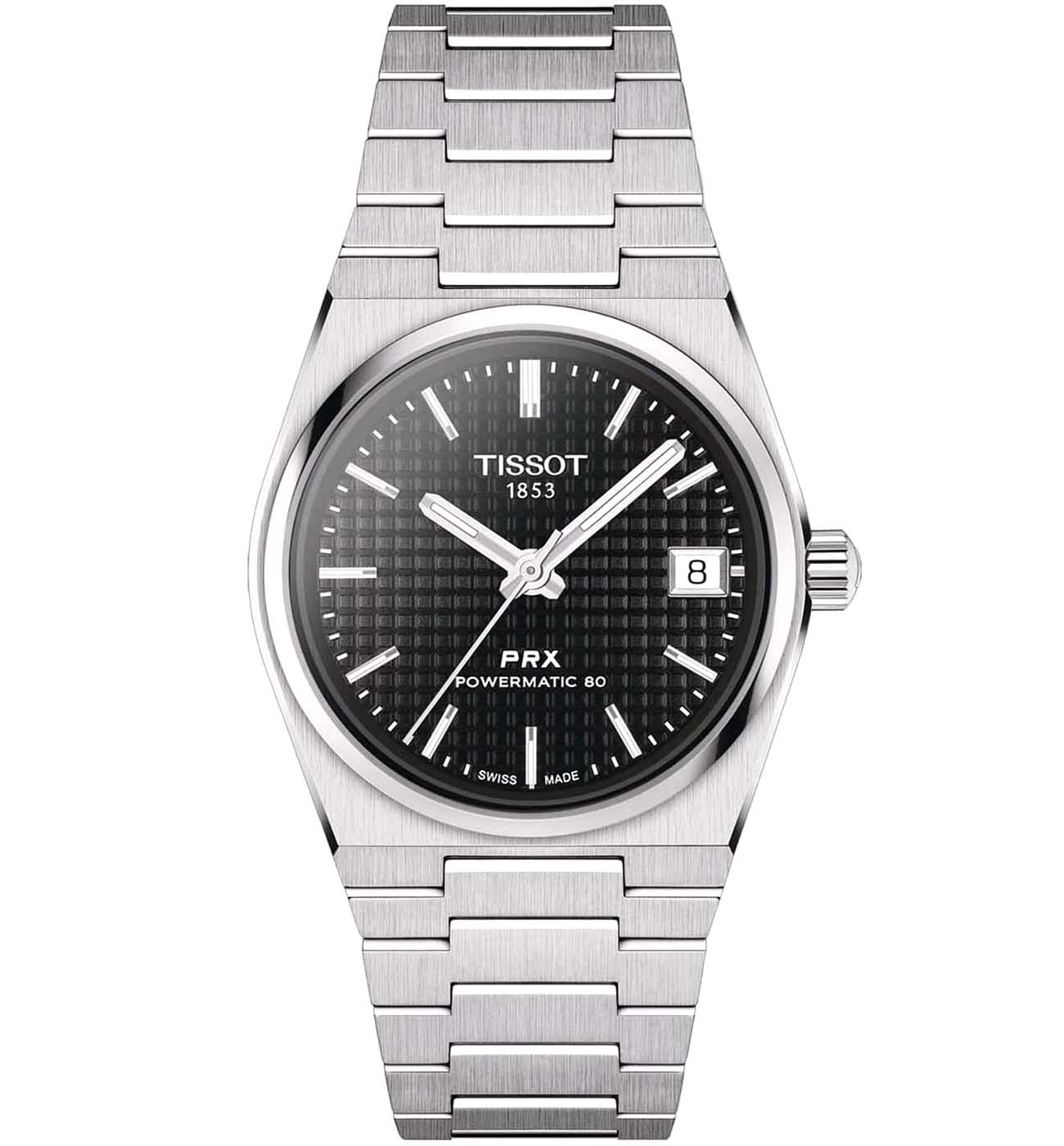 Женские швейцарские часы Tissot PRX Powermatic 80 T137.207.11.051.00, с автоматическим механизмом Powermatic 80.111. Циферблат с люминесцентным покрытиемЛюминесцентное покрытиеПозволяет считывать показания времени в темноте. Производители наносят на стрелки, часовые индексы, безель или поверхность циферблата светонакопительный состав, дающий холодное свечение. стрелок и меток. Эти 35-миллиметровые часы могут похвастаться корпусом из высококачественной стали и очаровательным циферблатом, вдохновленным их знаменитой предшественницей 1978 года. Характерный вафельный циферблат придает модели с автоматическим управлением дополнительный уровень элегантности. Водонепроницаемость до 100 метров и балансировочная спираль Nivachron™ делают часы PRX идеальным выбором для тех, кто разбирается в стиле. Браслет из стали гарантирует комфорт в течение всего дня. Устойчивое к появлению царапин сапфировое стеклоСапфировое стеклоПрочный и надёжный материал из кристалла сапфира синтетического происхождения, характеризующийся особой твёрдостью и устойчивостью к царапинам и повреждениям. с антибликовым покрытием. Браслет серебристого цвета с застёжкой-бабочкой с кнопкамиЗастёжка "бабочка"Такой вид застёжки дополняется предохранителями, помогающими избежать случайного раскрытия браслета. Обладают изящным исполнением. для расстегивания браслета.