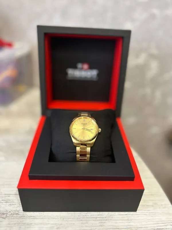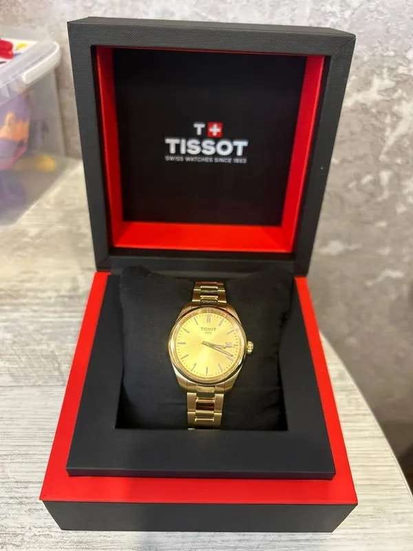 Женские швейцарские часы Tissot PR 100T150.210.33.021.00, кварцевый механизм с высокой точностью. Сапфировое стеклоСапфировое стеклоПрочный и надёжный материал из кристалла сапфира синтетического происхождения, характеризующийся особой твёрдостью и устойчивостью к царапинам и повреждениям. устойчивое к появлению царапин, обладающее высокой прозрачностью. Корпус часов изготовлен из нержавеющей стали 316L с PVD-покрытиемPVDУльтратонкое покрытие наносится в технике вакуумного напыления, сочетает в себе нитрид титана особой прочности со слоем золота или оксида хрома. Несёт в себе декоративную или защитную функцию. золотого цвета. Стрелки с люминесцентным покрытиемЛюминесцентное покрытиеПозволяет считывать показания времени в темноте. Производители наносят на стрелки, часовые индексы, безель или поверхность циферблата светонакопительный состав, дающий холодное свечение.. Окошко даты в положении 3 часов. Класс водозащиты: 100 метров, позволит плавать, нырять и заниматься другими водными видами спорта. Стальной браслет на застёжке-бабочке с кнопкамиЗастёжка "бабочка"Такой вид застёжки дополняется предохранителями, помогающими избежать случайного раскрытия браслета. Обладают изящным исполнением. .