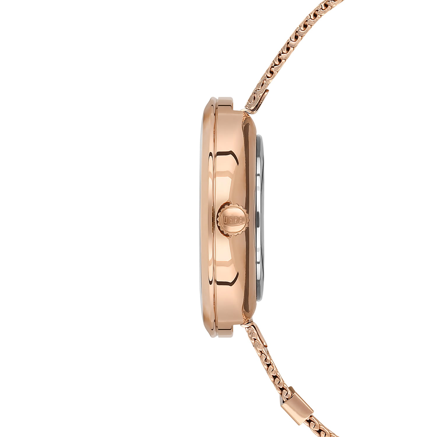 Женские часы U.S. Polo Assn. USPA2078-02 кварцевый механизм с высокой точностью. Минеральное стеклоМинеральное стеклоМинеральное стекло представляет собой искусственно выращенный минерал кварца. Такое стекло отличается особой устойчивостью к повреждениям и царапинам. Уступает по некоторым качествам сапфировому стеклу. устойчивое к появлению царапин, обладающее высокой прозрачностью. Корпус изготовлен из нержавеющей стали. Класс водозащиты: 30 метров, позволит защитить корпус от случайных брызг или капель дождя. Стальной браслет миланского плетения на раскладной застёжкеРаскладная застёжкаТакой тип застёжки используется только на браслетах из металла. Она никогда не раскрывается полностью, происходит разделение на 2 и более частей. Раскладывающая застёжка снизит вероятность потери часов к минимуму. с IP-покрытиемIP-покрытиеМетод ионного напыления. Демонстрирует повышенную устойчивость к истиранию, окислению и химическим веществам. Под воздействием высокого давления и температуры около 1500°C молекулы металла надёжно соединяются с частицами корпуса часов.. Неподвижный безельБезельВнешний ободок, закрепляющий стекло. В спортивных часах так называется поворотное кольцо с делениями на циферблате, выполняет роль таймера – замеряет отрезки времени на шкале. Неподвижный безель – элемент декора. Однонаправленно вращающийся безель на дайверских часах позволяет фиксировать моменты погружения и выныривания на поверхность. с IP-покрытиемIP-покрытиеМетод ионного напыления. Демонстрирует повышенную устойчивость к истиранию, окислению и химическим веществам. Под воздействием высокого давления и температуры около 1500°C молекулы металла надёжно соединяются с частицами корпуса часов..
