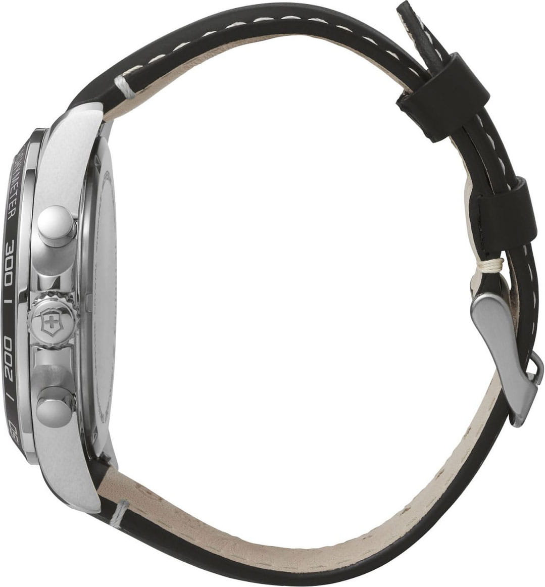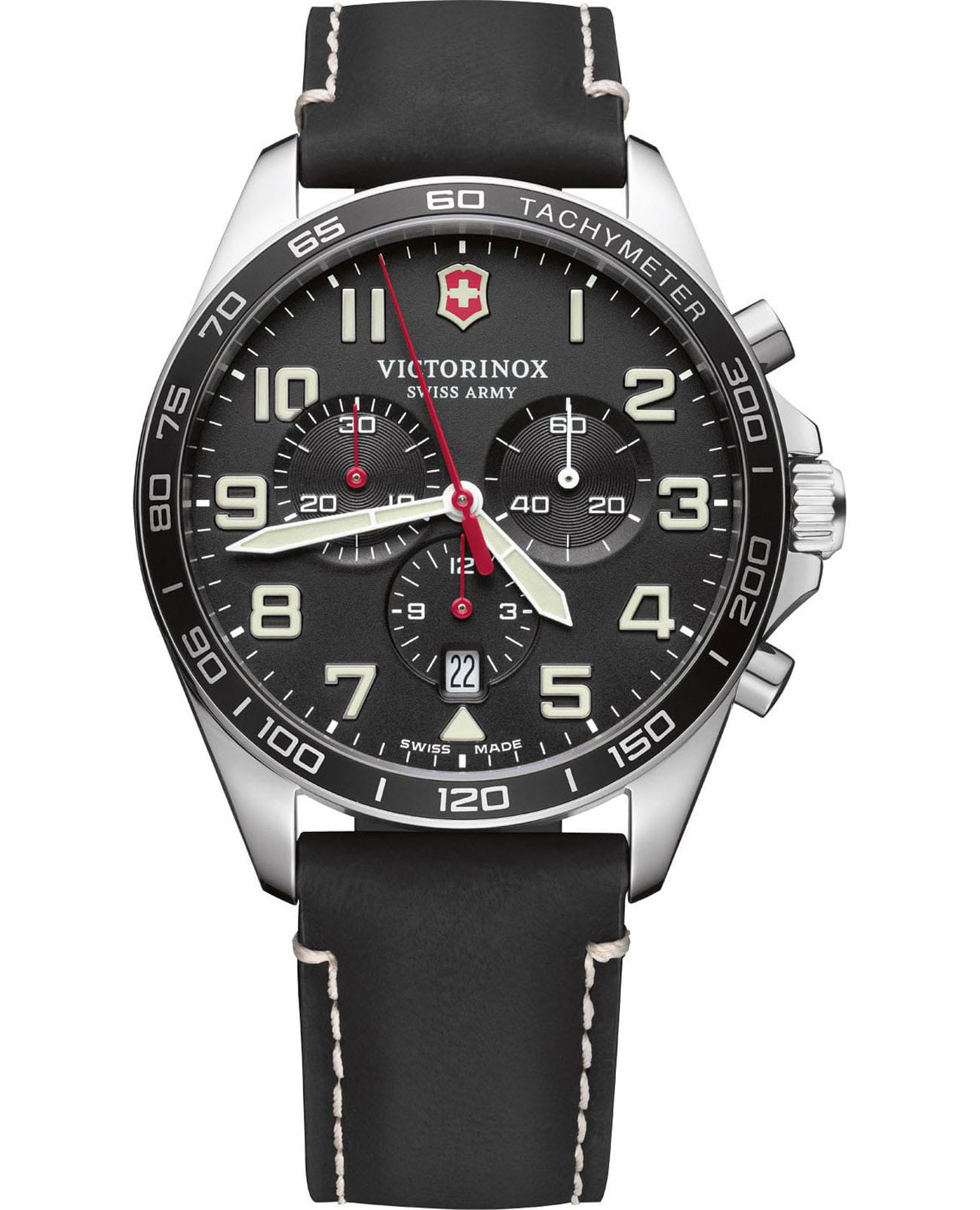 Мужские швейцарские часы-хронографХронографФункция позволяет измерять отрезки времени с особой точностью: часы, минуты, секунды. Верным признаком хронографа является наличие на циферблате 3 дополнительных окошек-счётчиков. Victorinox Fieldforce Chronograph 241852 с надёжным кварцевым механизмом. Сапфировое стеклоСапфировое стеклоПрочный и надёжный материал из кристалла сапфира синтетического происхождения, характеризующийся особой твёрдостью и устойчивостью к царапинам и повреждениям. с трёхслойным антибликовым покрытием. Корпус часов выполнен из стали с PVD-покрытиемPVDУльтратонкое покрытие наносится в технике вакуумного напыления, сочетает в себе нитрид титана особой прочности со слоем золота или оксида хрома. Несёт в себе декоративную или защитную функцию.. Практичный кожаный ремешок на стандартной застёжке. Влагозащита: 100 метров, позволит плавать, нырять и заниматься другими водными видами спорта. Окошко даты находится в положении 6 часов, стрелки и метки с люминесцентным покрытиемЛюминесцентное покрытиеПозволяет считывать показания времени в темноте. Производители наносят на стрелки, часовые индексы, безель или поверхность циферблата светонакопительный состав, дающий холодное свечение., тахиметрТахиметрРазмеченная шкала, располагается на ободке или безеле часов. Тахиметр позволяет рассчитать скорость на определённом участке пути, расстояние измеряется в километрах или милях..
