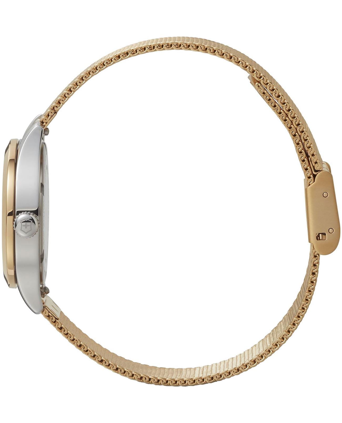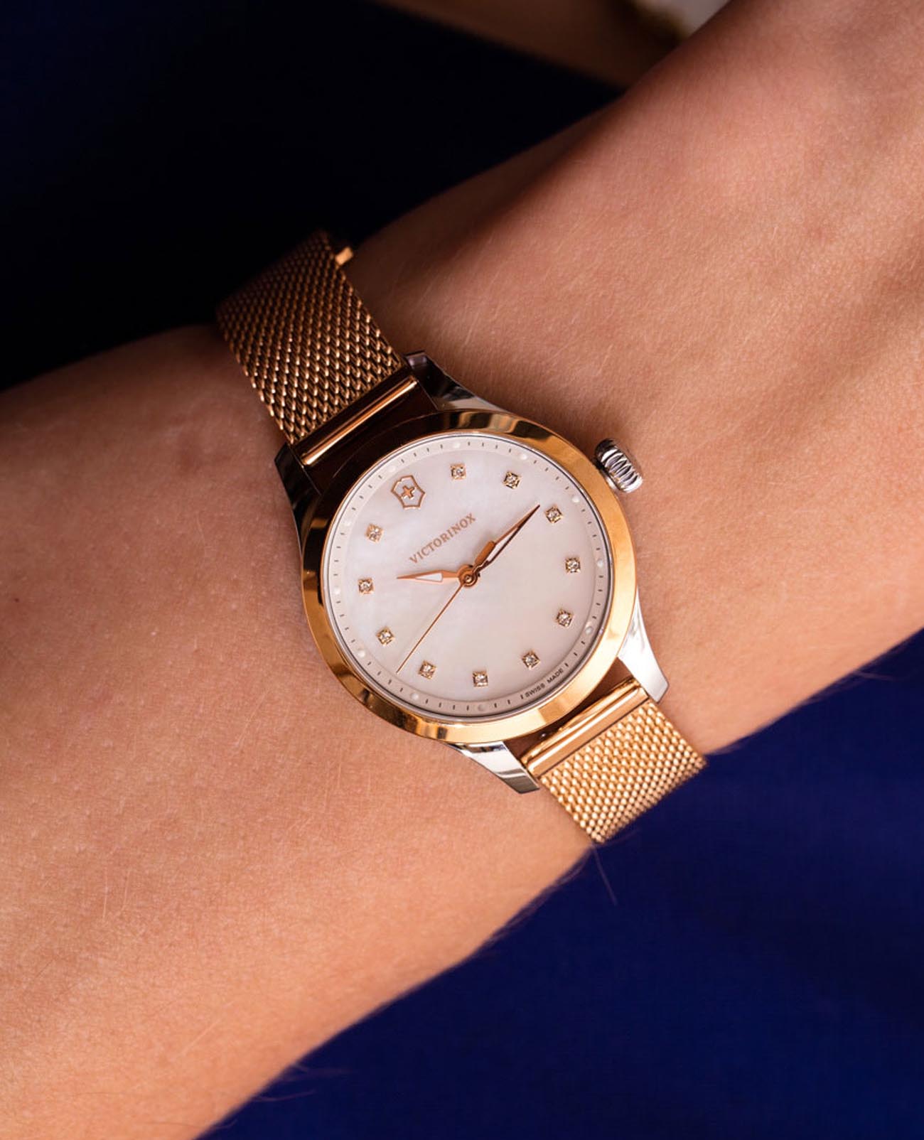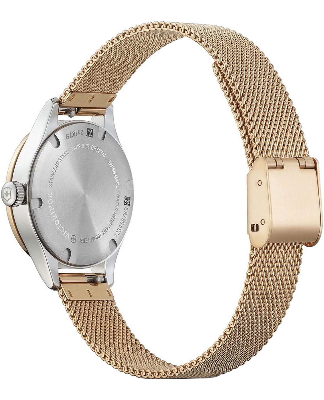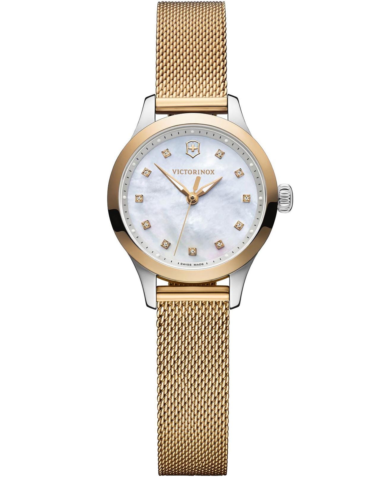 Женские часы Victorinox ALLIANCE XS 241879 с надёжным кварцевым механизмом. Корпус выполнен из нержавеющей стали с частичным PVD-покрытиемPVDУльтратонкое покрытие наносится в технике вакуумного напыления, сочетает в себе нитрид титана особой прочности со слоем золота или оксида хрома. Несёт в себе декоративную или защитную функцию.. Стальной браслет миланского плетения на раскладной застёжкеРаскладная застёжкаТакой тип застёжки используется только на браслетах из металла. Она никогда не раскрывается полностью, происходит разделение на 2 и более частей. Раскладывающая застёжка снизит вероятность потери часов к минимуму.. Циферблат инкрустирован кристаллами Swarovski. Стрелки и метки с люминесцентным покрытиемЛюминесцентное покрытиеПозволяет считывать показания времени в темноте. Производители наносят на стрелки, часовые индексы, безель или поверхность циферблата светонакопительный состав, дающий холодное свечение.. Уровень влагозащиты: 100 метров, позволит плавать, нырять и заниматься другими водными видами спорта.