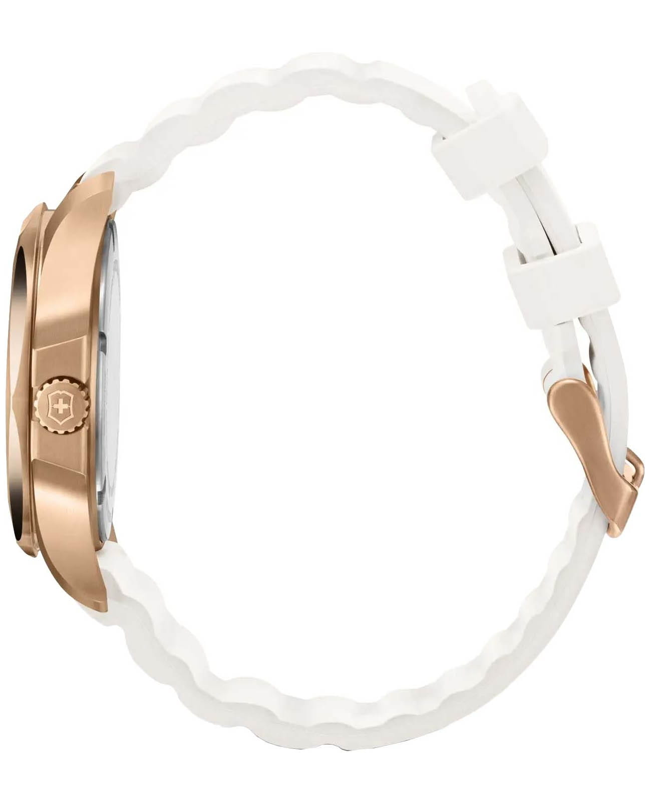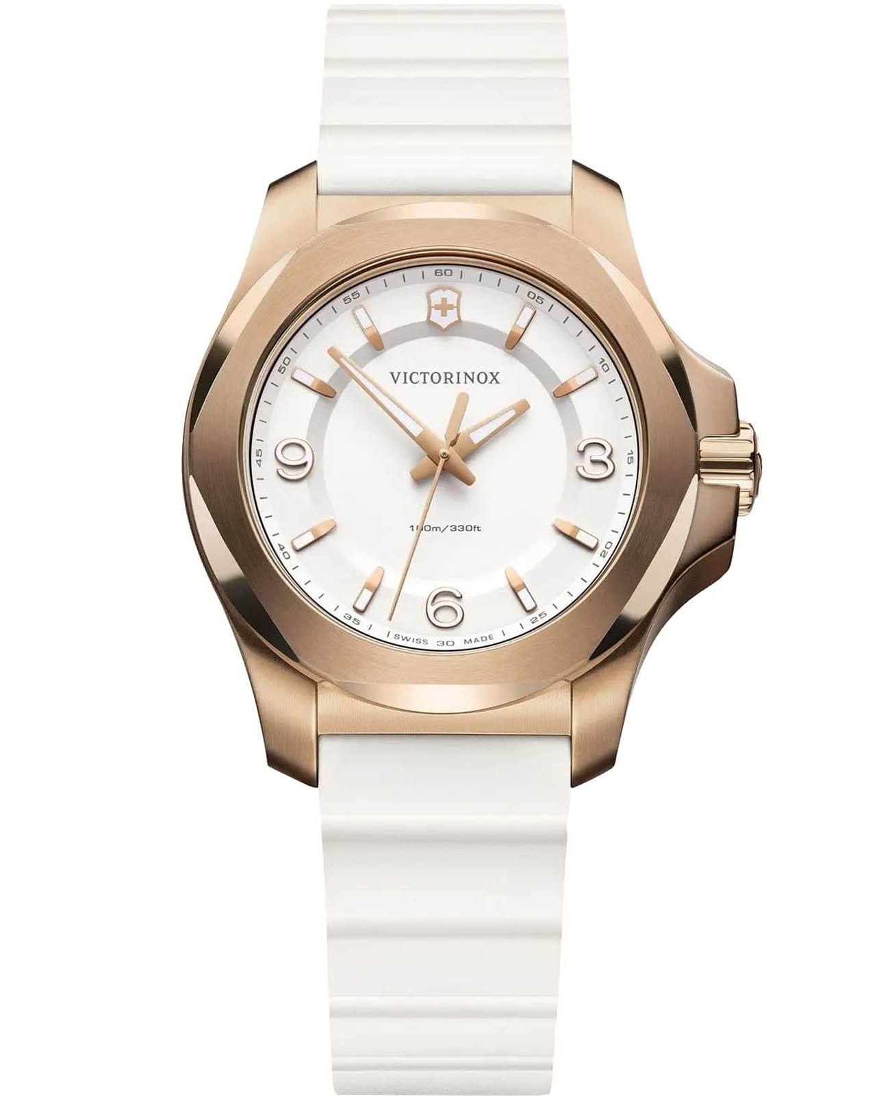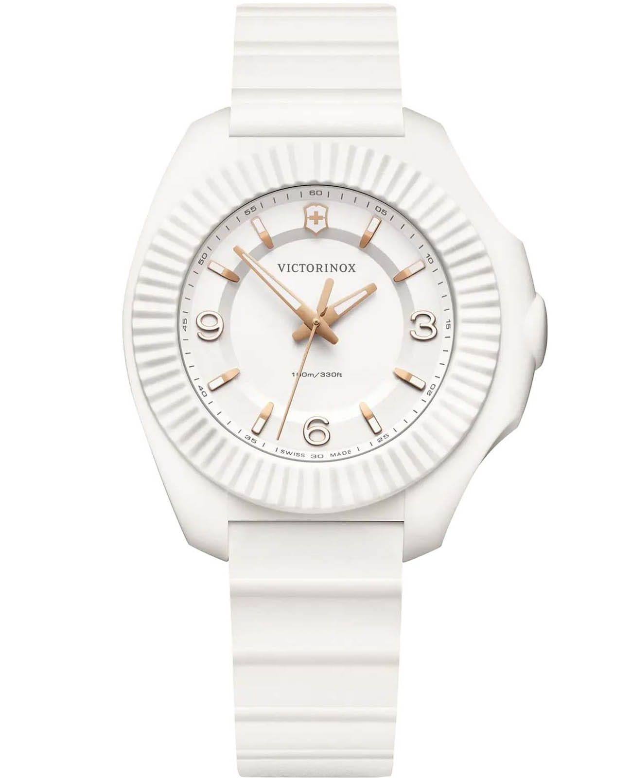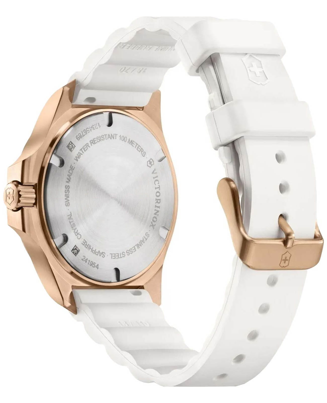 Женские швейцарские часы Victorinox I.N.O.X. V 241954. Сапфировое стеклоСапфировое стеклоПрочный и надёжный материал из кристалла сапфира синтетического происхождения, характеризующийся особой твёрдостью и устойчивостью к царапинам и повреждениям. с трёхслойным антибликовым покрытием. Корпус часов выполнен из нержавеющей стали 316L с PVD-покрытиемPVDУльтратонкое покрытие наносится в технике вакуумного напыления, сочетает в себе нитрид титана особой прочности со слоем золота или оксида хрома. Несёт в себе декоративную или защитную функцию.. Практичный каучуковый ремешок на стандартной застёжке. Влагозащита: 100 метров, позволит плавать, нырять и заниматься другими водными видами спорта. Стрелки и метки с люминесцентным покрытиемЛюминесцентное покрытиеПозволяет считывать показания времени в темноте. Производители наносят на стрелки, часовые индексы, безель или поверхность циферблата светонакопительный состав, дающий холодное свечение.. В комплекте съемный защитный бампер.