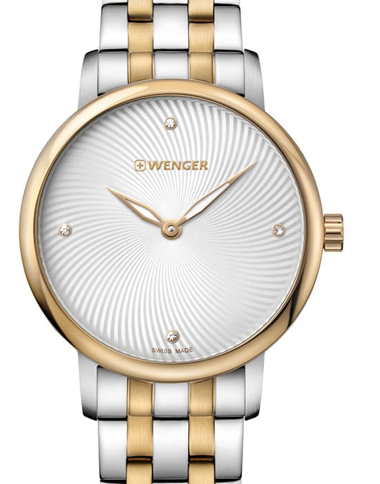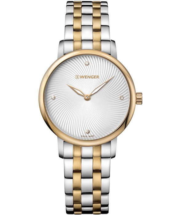 Женские швейцарские часы со стразами Wenger 01.1721.104, кварцевый механизм с высокой точностью. Класс водозащиты: 100 метров, позволит плавать, нырять и заниматься другими водными видами спорта. Корпус часов изготовлен из стали, золотистого цвета.