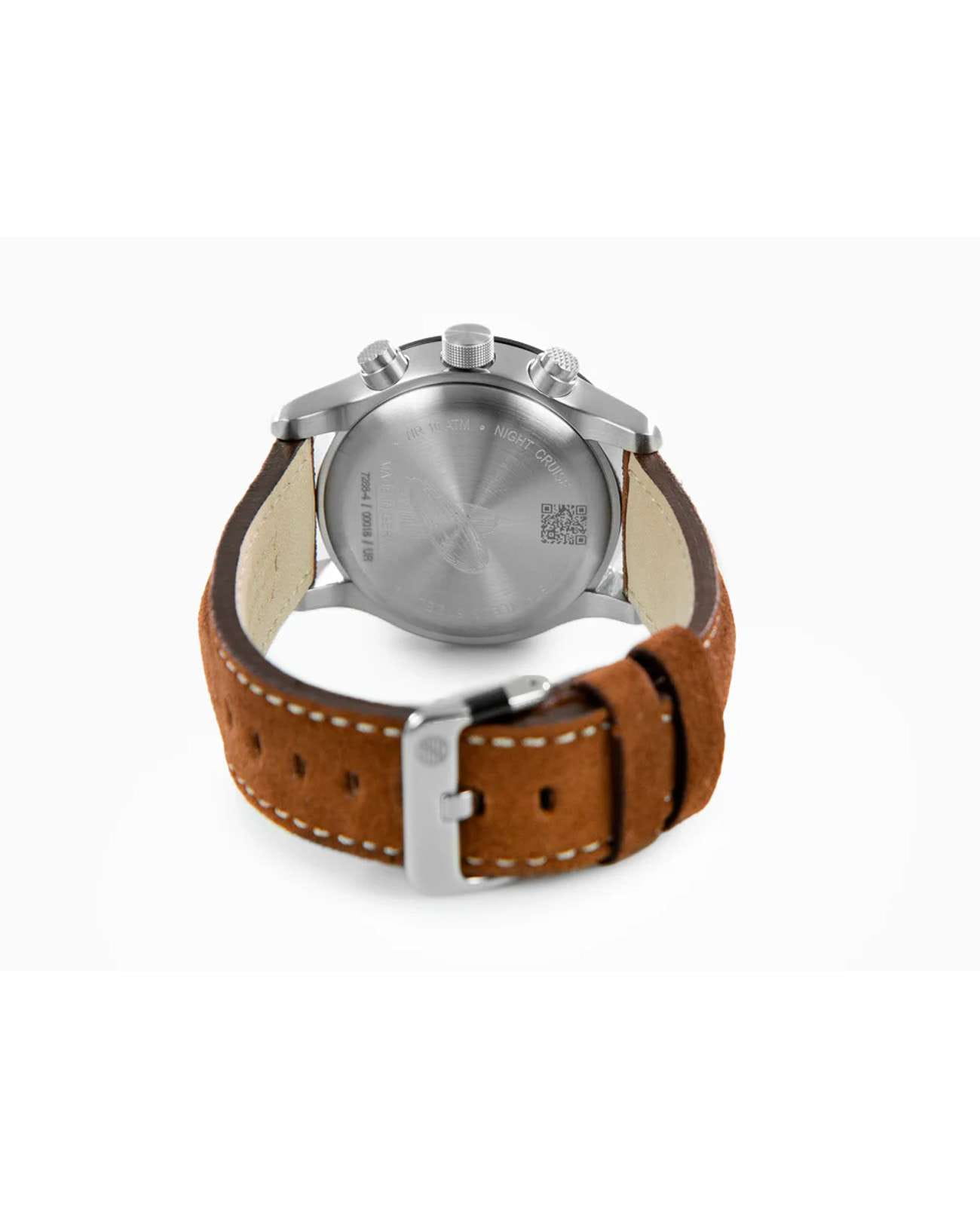 Мужские наручные часы-хронографХронографФункция позволяет измерять отрезки времени с особой точностью: часы, минуты, секунды. Верным признаком хронографа является наличие на циферблате 3 дополнительных окошек-счётчиков. Zeppelin Night Cruise 72884 сочетают в себе спортивный дизайн и функциональность. Модель обладает круглым корпусом диаметром 42 мм, изготовленным из нержавеющей стали, что обеспечивает высокую устойчивость к внешним воздействиям. Браслет выполнен из коричневой кожи с классической застежкой, гарантирующей комфортное ношение и стильный внешний вид. Зеленый циферблат оснащен шкалой с тахиметромТахиметрРазмеченная шкала, располагается на ободке или безеле часов. Тахиметр позволяет рассчитать скорость на определённом участке пути, расстояние измеряется в километрах или милях. по краю и дополнен малым секундомером, а также окном даты на позиции «4 часов». Для защиты используется минеральное стеклоМинеральное стеклоМинеральное стекло представляет собой искусственно выращенный минерал кварца. Такое стекло отличается особой устойчивостью к повреждениям и царапинам. Уступает по некоторым качествам сапфировому стеклу. с антибликовым покрытиемАнтибликовое покрытиеСлой оксида металла в 0,13-0,3 микрон, благодаря которому стекло часов не бликует и не отражает свет. Антибликовое покрытие уменьшает отражение света в 10 раз, обеспечивая отличную читаемость показателей циферблата., обеспечивающее прочную защиту от царапин и оптимальную видимость циферблата даже при ярком свете. Часы работают на кварцевом механизме ETA G10.212, который гарантирует точное время без необходимости подзаводки. Водонепроницаемость часов достигает 10 атмосфер (100 метров), что позволяет использовать их во время плавания и других водных видов спорта, однако не рекомендуется для глубоководного дайвинга.