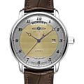 Мужские наручные автоматические часы Zeppelin ZEP-85625 из коллекции Friedrichshafen Automatic выполнены в классическом стиле и сочетают техническое совершенство с эстетикой ручной работы. Корпус круглой формы изготовлен из полированной нержавеющей стали, дополнен фирменными кольцами по краю — узнаваемым элементом бренда Zeppelin.Механизм — механический с автоподзаводом, оснащённый 21 камнем, с частотой 21 600 полуколебаний в час и запасом хода до 42 часов. Прозрачная задняя крышка позволяет наблюдать за работой механизма, что подчёркивает их техническую проработку.Циферблат выполнен по технологии гильоше с узором Clous de Paris , добавляющим благородства дизайну. Метки представлены арабскими цифрами. Окошко даты расположено в положении 3 часов, указатель дня недели — в положении 12 часов.Часы оснащены выпуклым минеральным стеклом повышенной прочности K1 минеральное стеклоМинеральное стеклоМинеральное стекло представляет собой искусственно выращенный минерал кварца. Такое стекло отличается особой устойчивостью к повреждениям и царапинам. Уступает по некоторым качествам сапфировому стеклу., устойчивым к мелким повреждениям. Заводная головка — рифлёная, из нержавеющей стали. Ремешок — из коричневой натуральной кожи с текстурой, имитирующей крокодилову кожу, дополнен классической застёжкой из нержавеющей стали.Водозащита — 50WR , что позволяет использовать часы в повседневных условиях без риска повреждения от случайных брызг воды. Габаритные размеры: диаметр 40 мм, толщина 12 мм, вес — 68 граммов. Это стильный и надёжный аксессуар для ценителей механических часов и традиций часового мастерства.