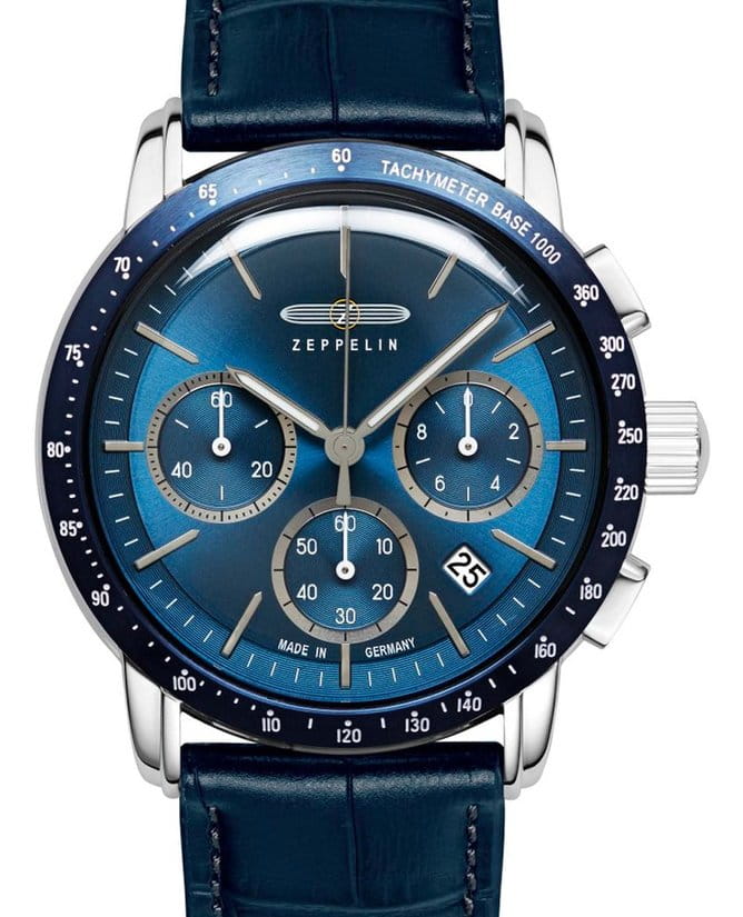Мужские наручные часы-хронографХронографФункция позволяет измерять отрезки времени с особой точностью: часы, минуты, секунды. Верным признаком хронографа является наличие на циферблате 3 дополнительных окошек-счётчиков. Zeppelin New York 88783 сочетают в себе классический дизайн и функциональность современных технологий. Модель обладает круглым корпусом диаметром 42 мм, изготовленным из нержавеющей стали, что обеспечивает высокую устойчивость к внешним воздействиям. БезельБезельВнешний ободок, закрепляющий стекло. В спортивных часах так называется поворотное кольцо с делениями на циферблате, выполняет роль таймера – замеряет отрезки времени на шкале. Неподвижный безель – элемент декора. Однонаправленно вращающийся безель на дайверских часах позволяет фиксировать моменты погружения и выныривания на поверхность. с IP-покрытиемIP-покрытиеМетод ионного напыления. Демонстрирует повышенную устойчивость к истиранию, окислению и химическим веществам. Под воздействием высокого давления и температуры около 1500°C молекулы металла надёжно соединяются с частицами корпуса часов.. Браслет выполнен из натуральной кожи с классической застежкой, гарантирующей комфортное ношение и стильный внешний вид. Синий циферблат оснащен шкалой тахиметраТахиметрРазмеченная шкала, располагается на ободке или безеле часов. Тахиметр позволяет рассчитать скорость на определённом участке пути, расстояние измеряется в километрах или милях., малыми циферблатами для хронографа, а также окном даты. Для защиты используется минеральное стеклоМинеральное стеклоМинеральное стекло представляет собой искусственно выращенный минерал кварца. Такое стекло отличается особой устойчивостью к повреждениям и царапинам. Уступает по некоторым качествам сапфировому стеклу. с антибликовым покрытиемАнтибликовое покрытиеСлой оксида металла в 0,13-0,3 микрон, благодаря которому стекло часов не бликует и не отражает свет. Антибликовое покрытие уменьшает отражение света в 10 раз, обеспечивая отличную читаемость показателей циферблата., обеспечивающее прочную защиту от царапин и оптимальную видимость циферблата даже при ярком свете. Часы работают на кварцевом механизме, который гарантирует точное время без необходимости подзаводки. Водонепроницаемость часов достигает 5 атмосфер (50 метров), что позволяет использовать их в повседневной жизни, однако не рекомендуется для плавания или дайвинга.